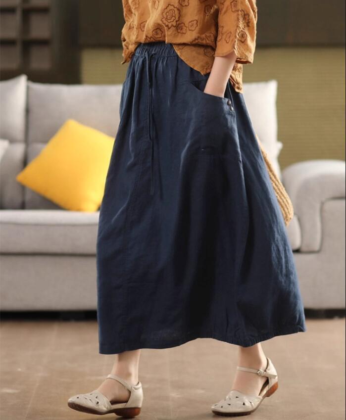 > 新入荷*レディース フレアスカート ロングスカート ボトムス ウエストゴム 着痩せ 美脚 通勤 きれいめ Aライン リネンスカート*ネイビー