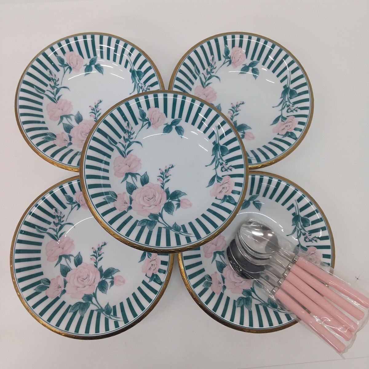 - 517 中古 プレート 5枚セット レトロ柄 バラ柄 スプーン付き カレー皿 パスタ皿 AOI CHINA 直径20cm 洋食器 丸皿