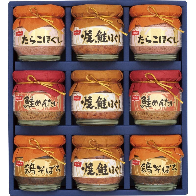 ▼▼▼▼▼▼注意事項▼▼▼▼▼▼・送料込み(送料800円が商品価格に含まれています) 一部地域では追加送料あり。・お取り寄せ商品です。弊社にて手配後、メーカー・卸業者からの直送になります。・まれにメーカー欠品、出荷遅延等が発生致します。問題発生時は別途メールにてご連絡致します。・配送方法の指定、日時指定、置き配、ギフト対応、他商品との同梱配送などは対応できません。・まとめ買いや複数購入の場合は通常より発送に時間が掛かる場合がございます・複数個口の場合、2階以上への搬入ができない場合があります。(その場合は1階での受け渡しとなります)・大型連休、お盆、年末年始などは発送をお休みさせていただく場合がございます・メーカー都合により、パッケージは予告なく変更される場合がございます・梱包用のダンボールはリサイクル品を使用させていただきます。・注文に関するご連絡(注文確定通知・発送通知など)はメールでご案内させていただきます※商品ページの内容について、少しでもご不明な点などがございましたら購入前に一度ご連絡ください▲▲▲▲▲▲注意事項▲▲▲▲▲▲〇商品説明ごはんやおにぎりなどにご利用いただけるびん詰をアソートしました。〇商品仕様【パッケージサイズ】232×74×255mm【内容】焼鮭ほぐし50g×3、たらこほぐし50g・鮭めんたい50g・鶏そぼろ50g×各2【アレルゲン】小麦【生産国】日本【パッケージ形態】化粧箱入【保存方法】常温【賞味期限】製造日より約730日(出典:日本水産)