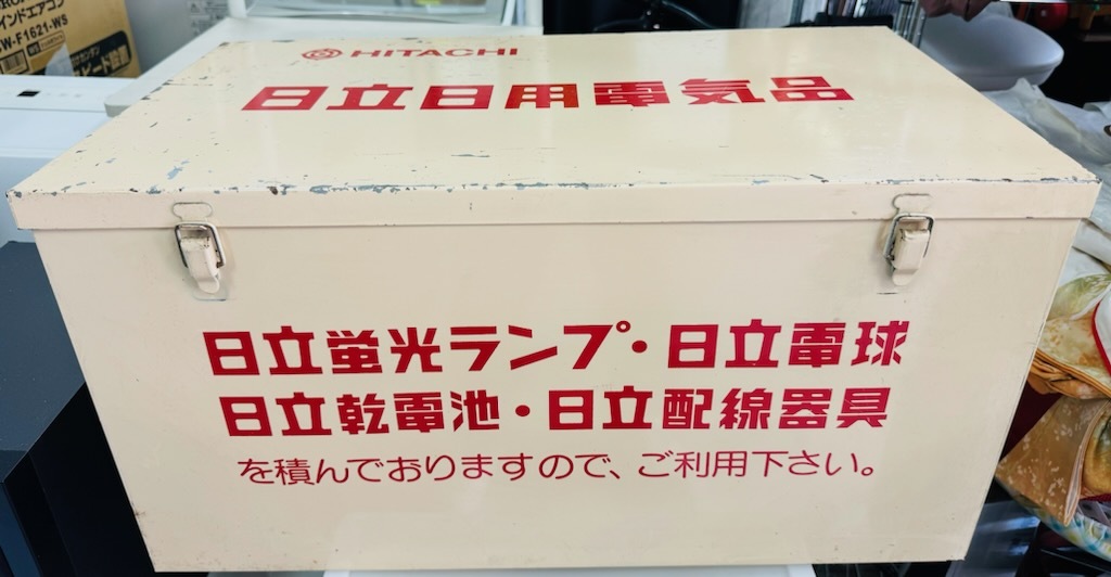 > 激レア HITACHI 日立日用電気品 ランプ 電球 乾電池 配線器具 電動工具 日用工具用品でも スチール 収納ケース 箱 USEDです