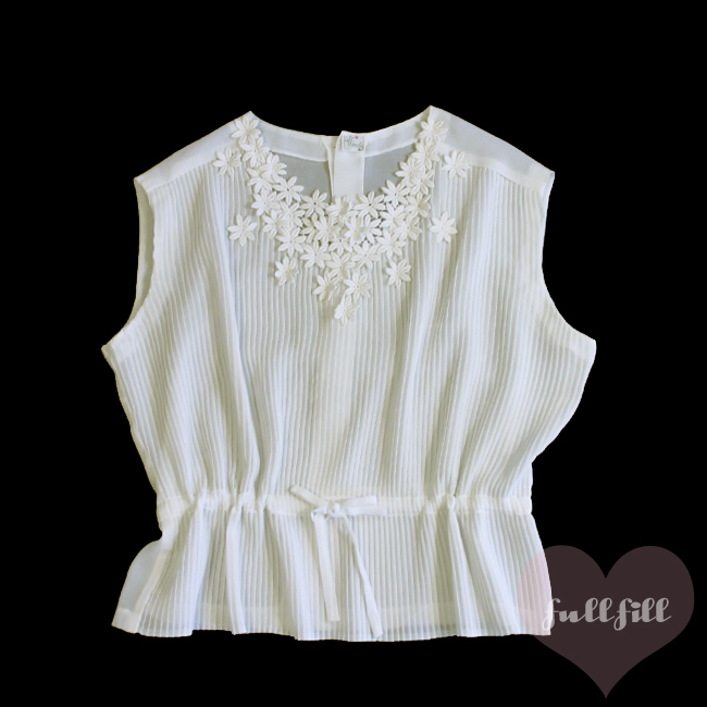 - 古着 プリーツトップス ノースリーブ ブラウス ホワイト 白 花 ガーリー レトロ ヴィンテージ ビンテージ vintage used レディース古着