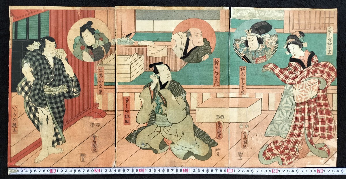 > 江戸期/真作 歌川豊国「主馬小金吾」本物浮世絵木版画 歌舞伎絵 役者絵 芝居絵 錦絵 大判 三枚続き 裏打ち