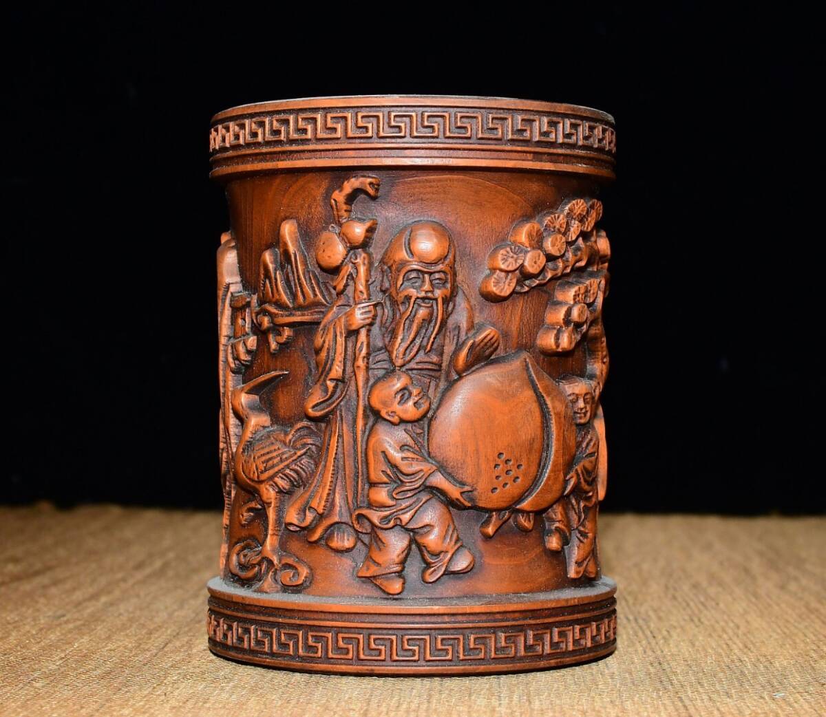 - 『館蔵珍品 黄楊木製 細密彫 寿星筆筒 置物 賞物』稀少珍蔵品 古賞物 貴重物品 収蔵品 中国古美術 時代物 古董品
