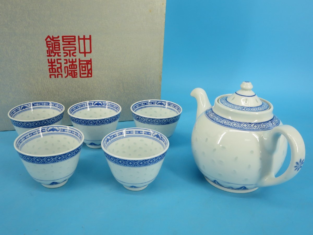 > 未使用 美品 景徳鎮 急須 煎茶碗 蛍手 湯呑 直径約7.5㎝ 五客 茶器 中国 茶道具 共箱 現状品 梱包方法B (中 NJP14