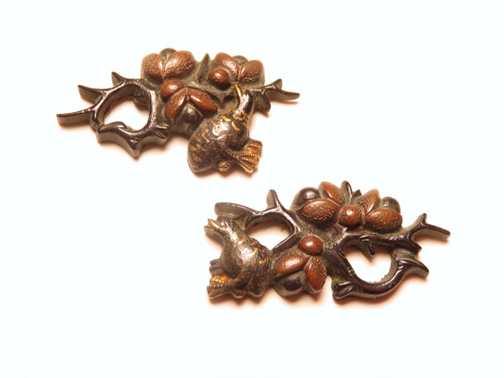 - 【11219】刀装具 江戸~明治 赤銅地 鶉 目貫(初品・買取品)
