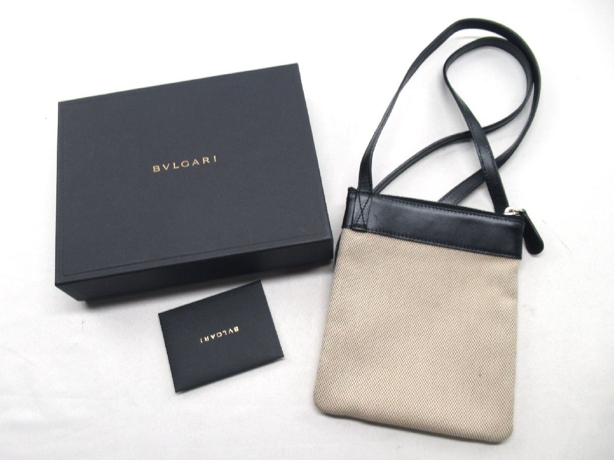 > ★【B送900円】2180 BVLGARI ブルガリ フラットポーチショルダーバッグ ポシェット レザー ベージュ×黒 シルバー金具 クロスボディ