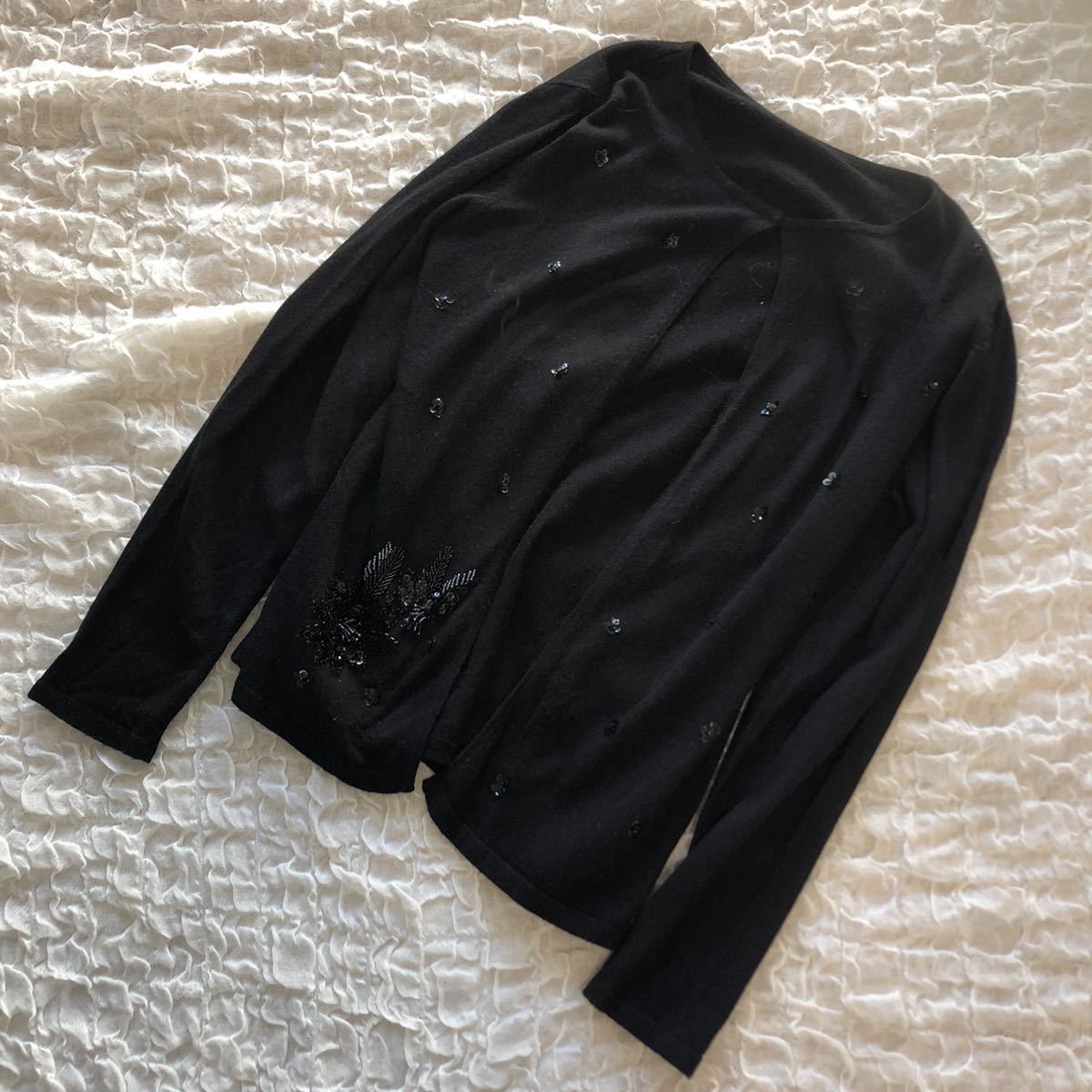 - LAVITA ラヴィータ スパンコール ビーズ 刺繍 長袖 カーディガン 1つスナップ ブラック M ★1000