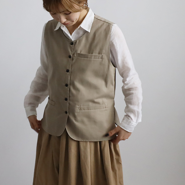 - 最終SALE 裏地付 ポケット付 ベスト ジレ 後ろリボン紐付き ゆったり 羽織 コットンチノ生地 ベージュY98V