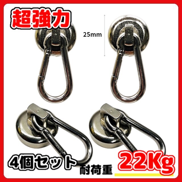 - (A) 超強力 マグネットフック カラビナ 25mm 4個セット ネオジム磁石 強力 磁石 耐荷重22Kg ステンレス マグネット 防錆 防水