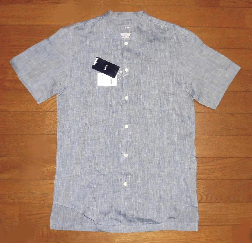 - SHIPS FRENCH LINEN シップス ノーカラー シャツ 半袖 フレンチリネン リネン 麻 メンズ 定11000円 正規品 BLUE S 紙タグ付 未使用品