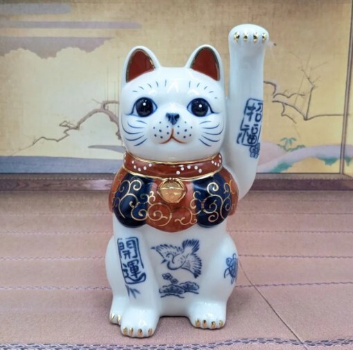 - 招き猫 縁起物 染錦開運招福招き猫 手長左手上げ 4.5号 置物