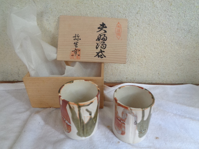 - 陶器 美濃焼 湯呑セット/弥生窯 夫婦湯呑/記念品/箱付未使用美品-保管品