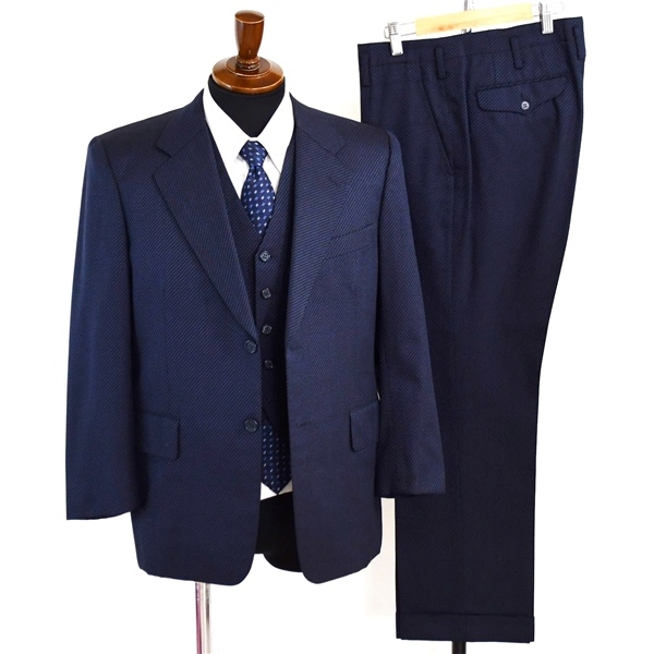 春秋対応。ベスト付き。2つボタンシングル。袖口3つ釦開き見せ。背抜き。センターベント。フラップポケット。ネーム刺繍あり。
