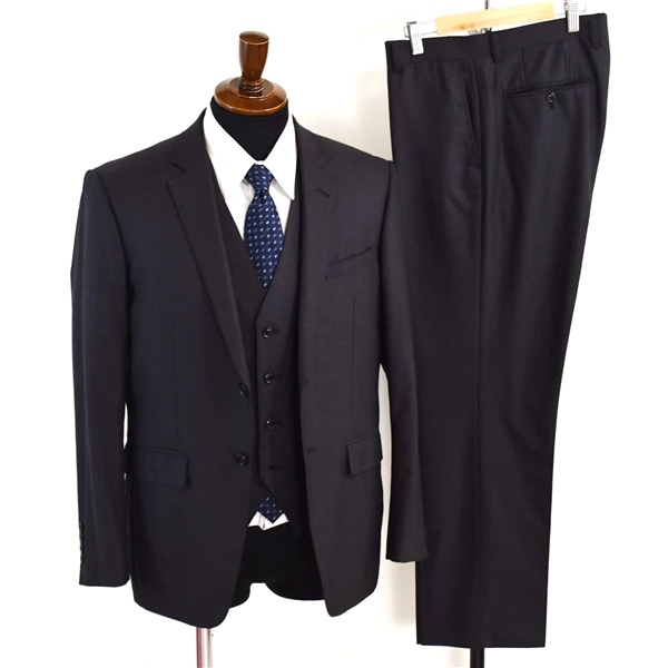・春秋対応。ベスト付き。2つボタンシングル。袖口4つ釦開き見せ。背抜き。センターベント。フラップポケット。ネーム刺繍なし。