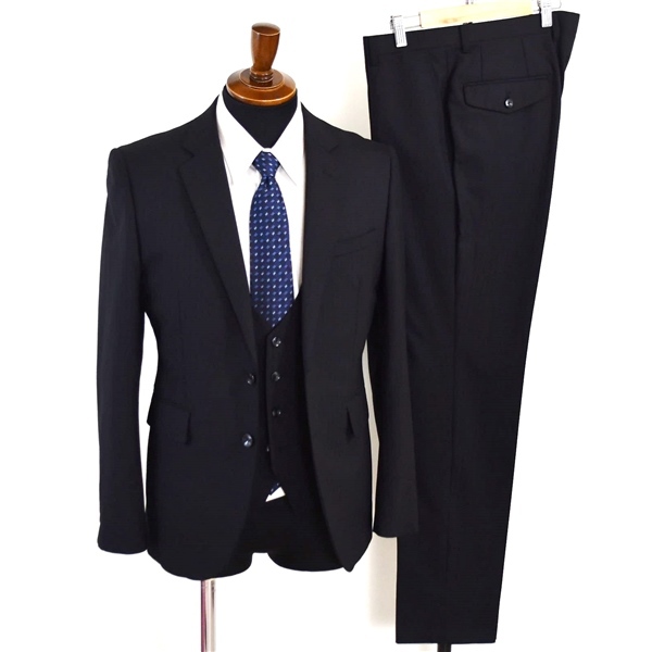 ・春秋対応。ベスト付き。2つボタンシングル。袖口4つ釦開き見せ。総裏地仕上げ。ノーベント。フラップポケット。ネーム刺繍なし。
