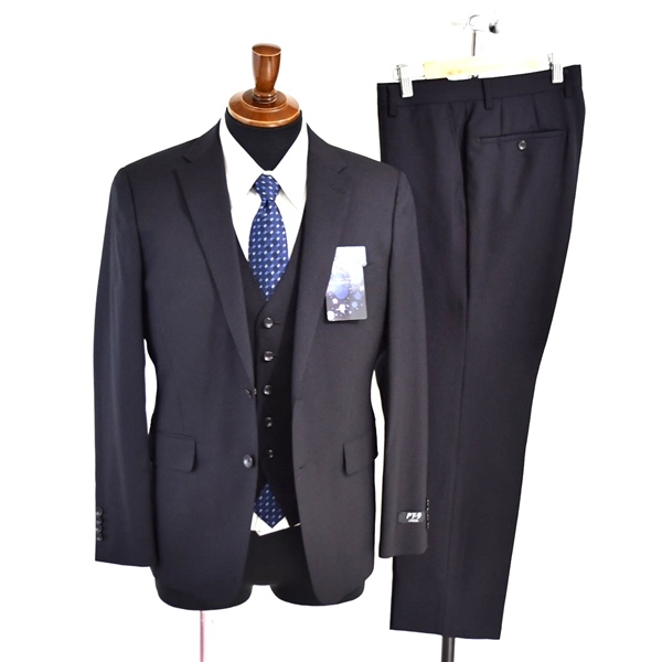 ・新品同様。未使用品。ドーコインターナショナル(株)。3ピース。型番:PAA008。春夏秋冬対応。2つボタンシングル。フラップポケット。センターベント。袖口4つボタン。本切羽。背抜き。6つボタンベスト。ネーム刺繍なし。