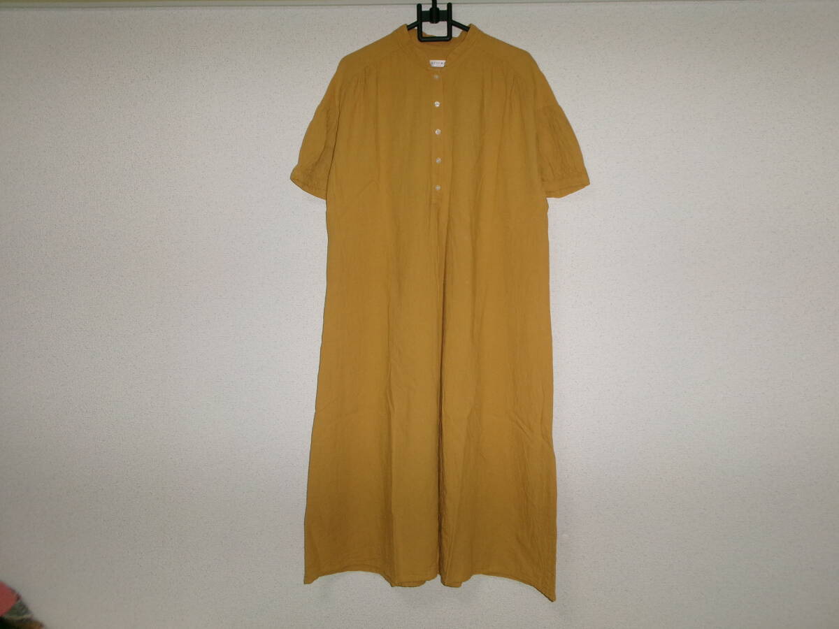 > ESSEMEエシーム☆くすみイエローからし色の半袖チュニックワンピース☆ゆったりふんわり♪スモッグ風☆ナチュラル♪麻混リネン素材 Mサイズ