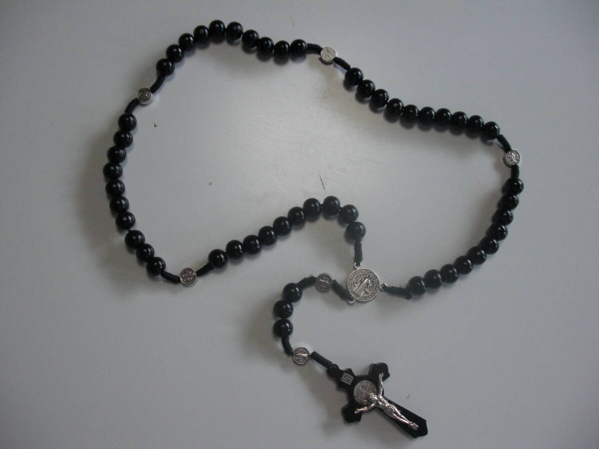 - 木製ビーズ10mm・手作りアンティーク仕上げロザリオ・キリスト十字架ネックレス・黒色・チカーノ・ローライダー・ギャングスタ・