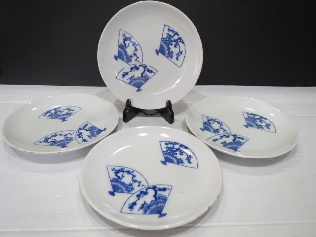 - 当時物 オールドコオラン② 香蘭社 白磁印判 扇文 陰刻ロゴマーク 6寸皿 18.6㎝ 4客 無傷
