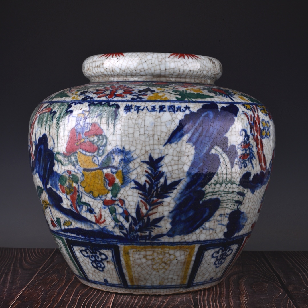 > 8~QN6842 中国磁器 陶芸 磁器『元至正八年青花五彩鬼谷子下山紋缶』施釉陶 古代工芸品 陶芸 精美彫 置物 收藏品