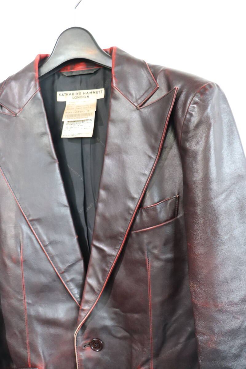 - 2000年代初頭 即決 KATHARINE HAMNETT LONDON キャサリンハムネット 茶赤クラッキング加工 ピークドラペル レザーテーラードジャケット S