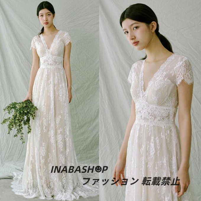 > ウェディングドレス Vネック トレーンタイプ スレンダーライン ウエディングドレス 袖付き 袖あり ウェディング 花嫁ドレス 結婚式 レース