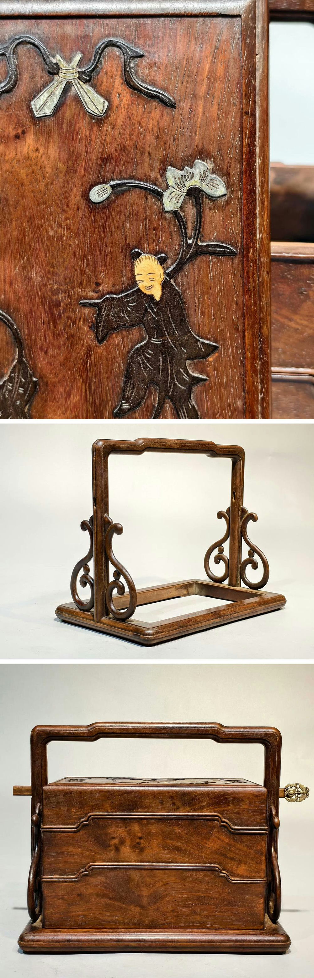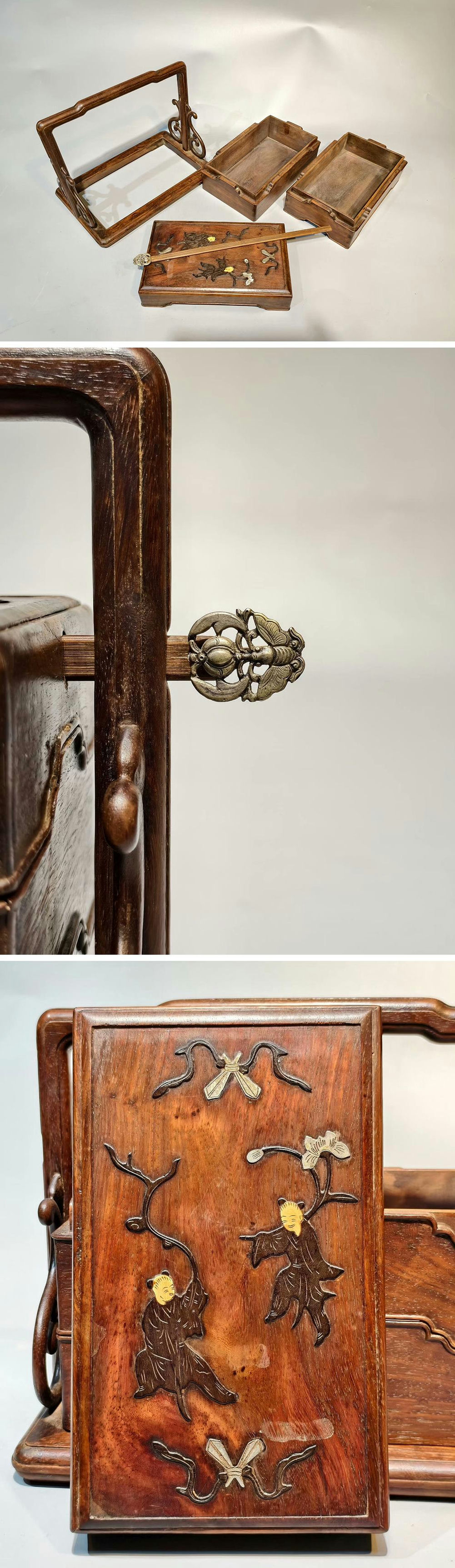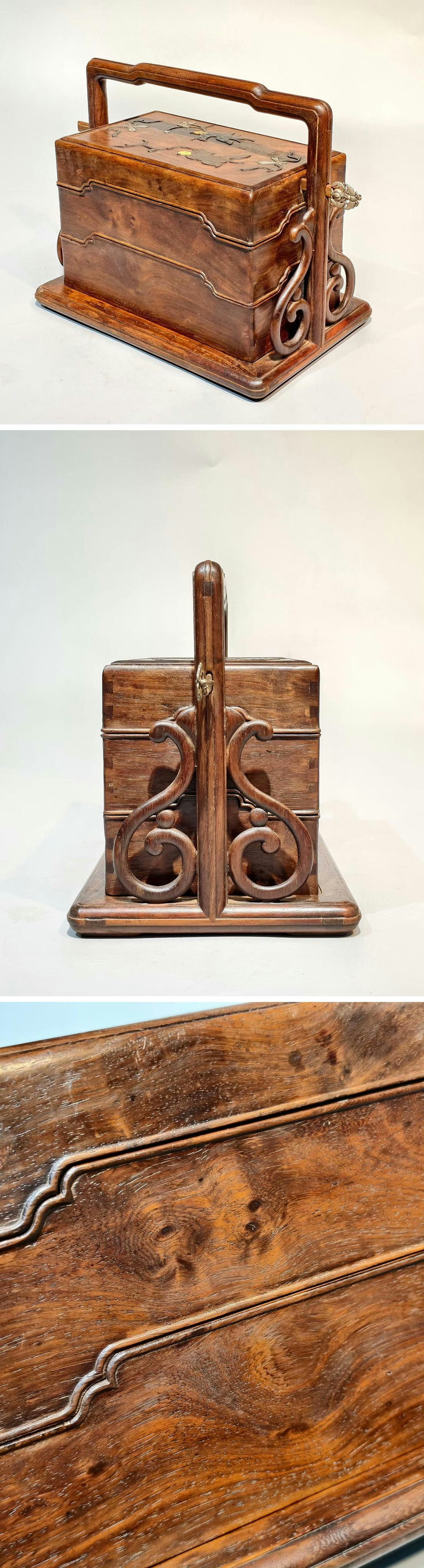 - ▼渡鶴羽▼R842清時代 黄花梨提箱 黄花梨象嵌人物根彫 黄花梨木細密細工★古置物★古賞物★古擺件★蒐集家放出★唐物