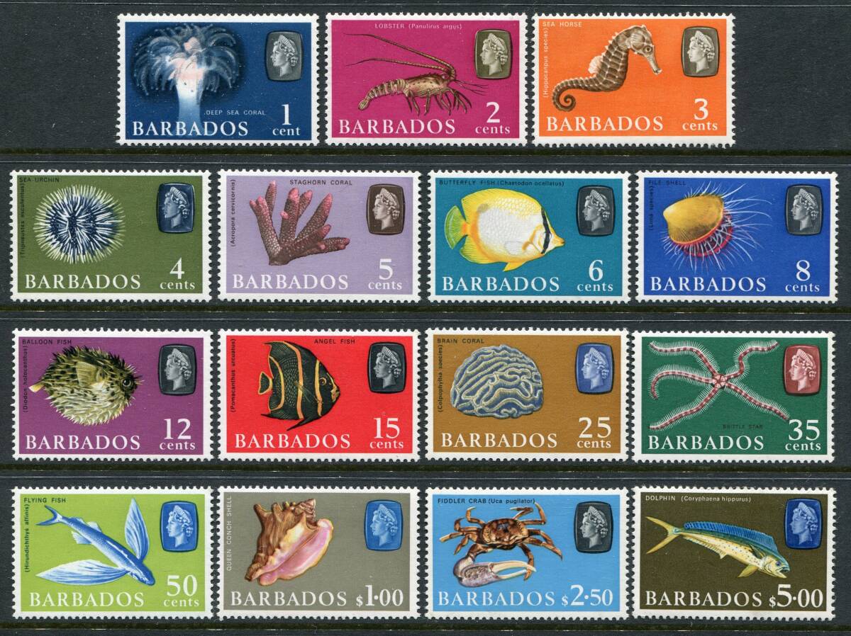 - 英領ロングセット バルバドス SC:267a-280B 1966-69年 水産 魚 貝 15種完 未使用 z9734