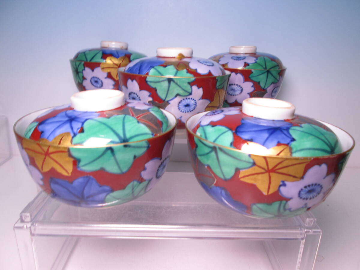 - ☆お料理屋さんの器 白泉作 金彩色絵桜に紅葉文華やかな蓋向付 五客 蓋茶碗/茶懐石/割烹/日本料理