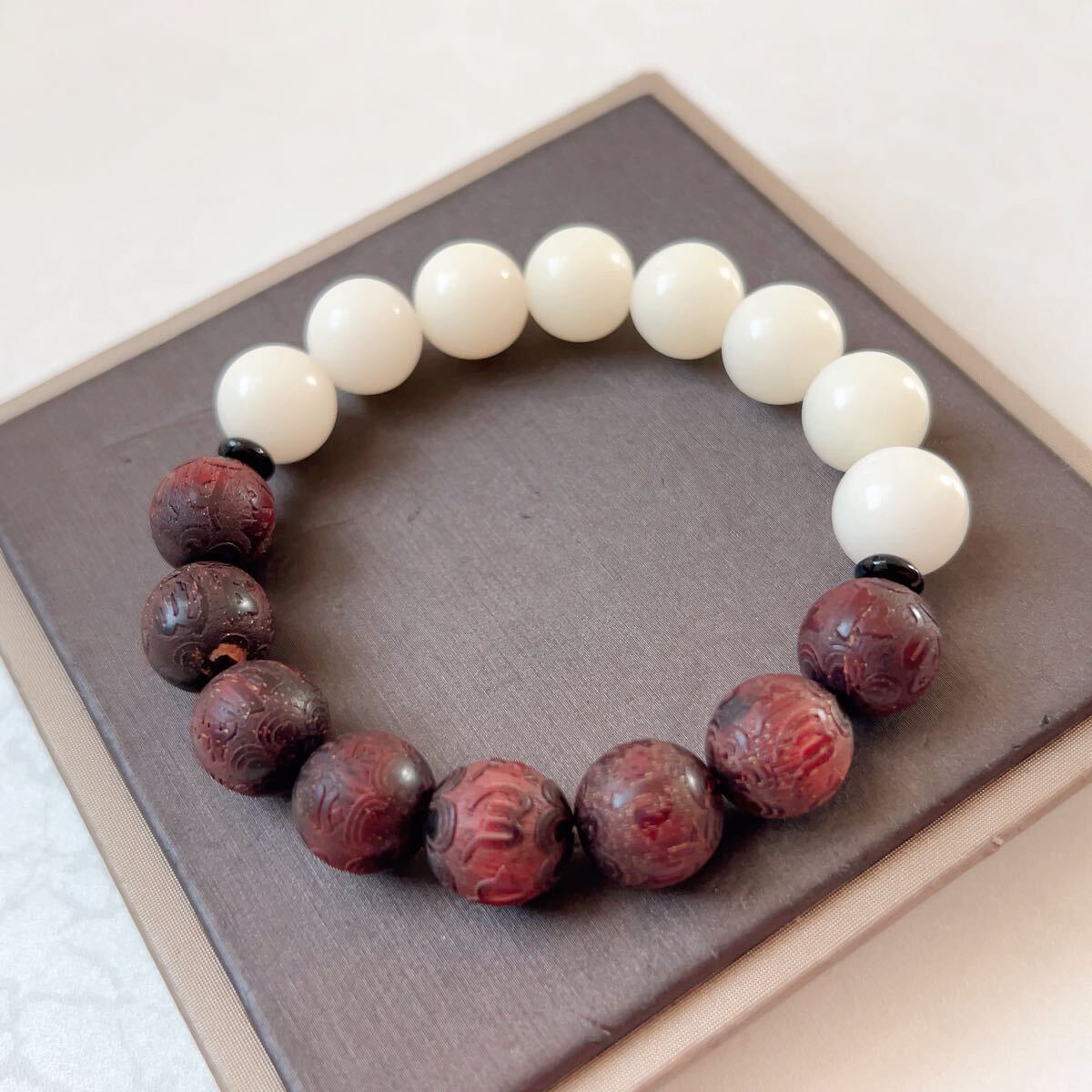 - ◇菩提樹の根◇白玉菩提+紫檀六字真言 彫刻◇ブレスレット◇男女兼用◇天然木◇数珠・念珠・木珠◇巾着袋付き◇プレゼントにも 035B8171