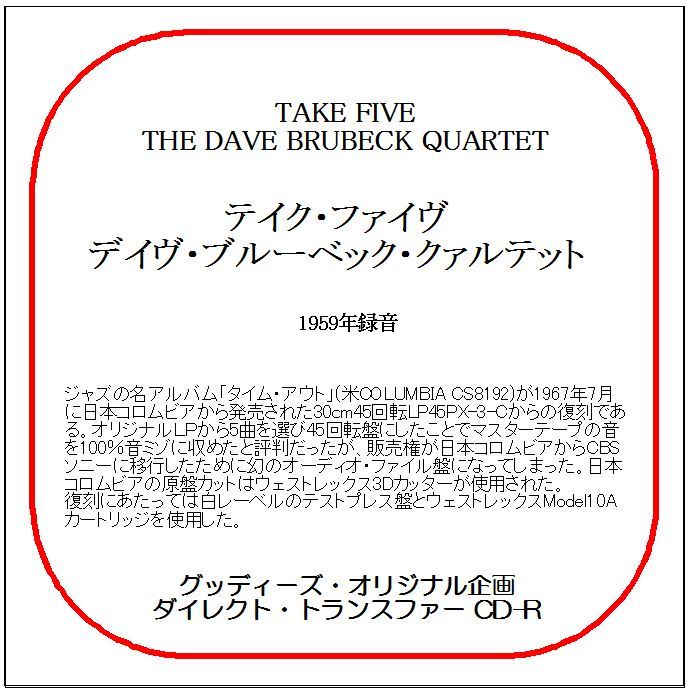 - テイク・ファイヴ/デイヴ・ブルーベック・クァルテット/送料無料/ダイレクト・トランスファー CD-R