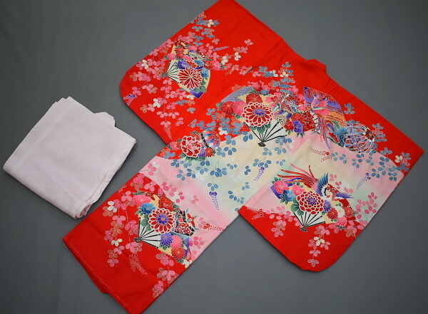 > A50-10【凛々】即決 中古品 正絹 お宮参り 女児 初着 祝着 赤 扇子 花 萩 長襦袢付
