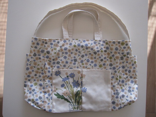 - ○ハンドメイド○大きなトートバッグ〔淡い小花模様=生成り〕ポケットたくさん 卵10個パックが入るサイドボケット