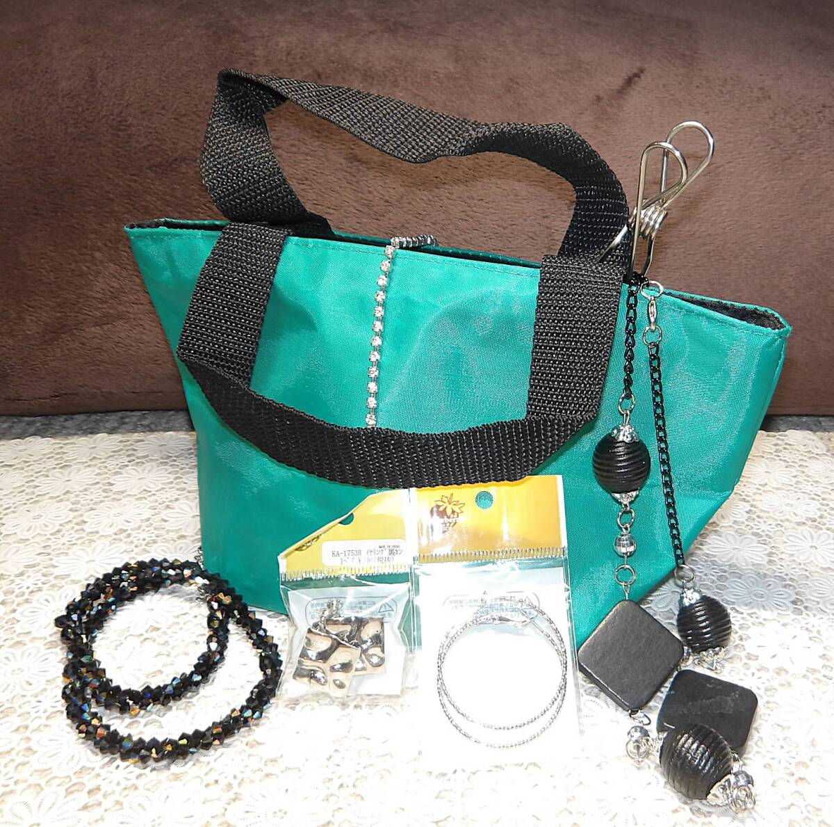 > セール★イヤリングorピアス選べるアクセサリーセット⑱ ミニトートバッグ・ネックレス・デザインネックレス グリーン黒シルバー