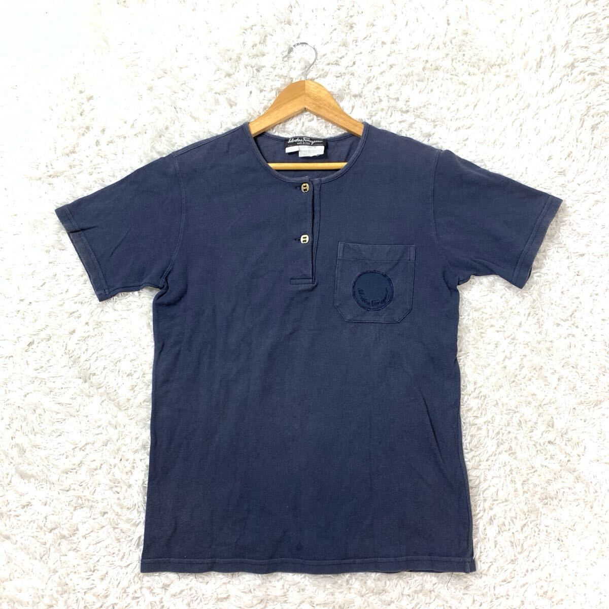 - Salvatore Ferragamo サルヴァトーレフェラガモ 半袖トップス 金ボタン 紺 ネイビー コットン YA9160