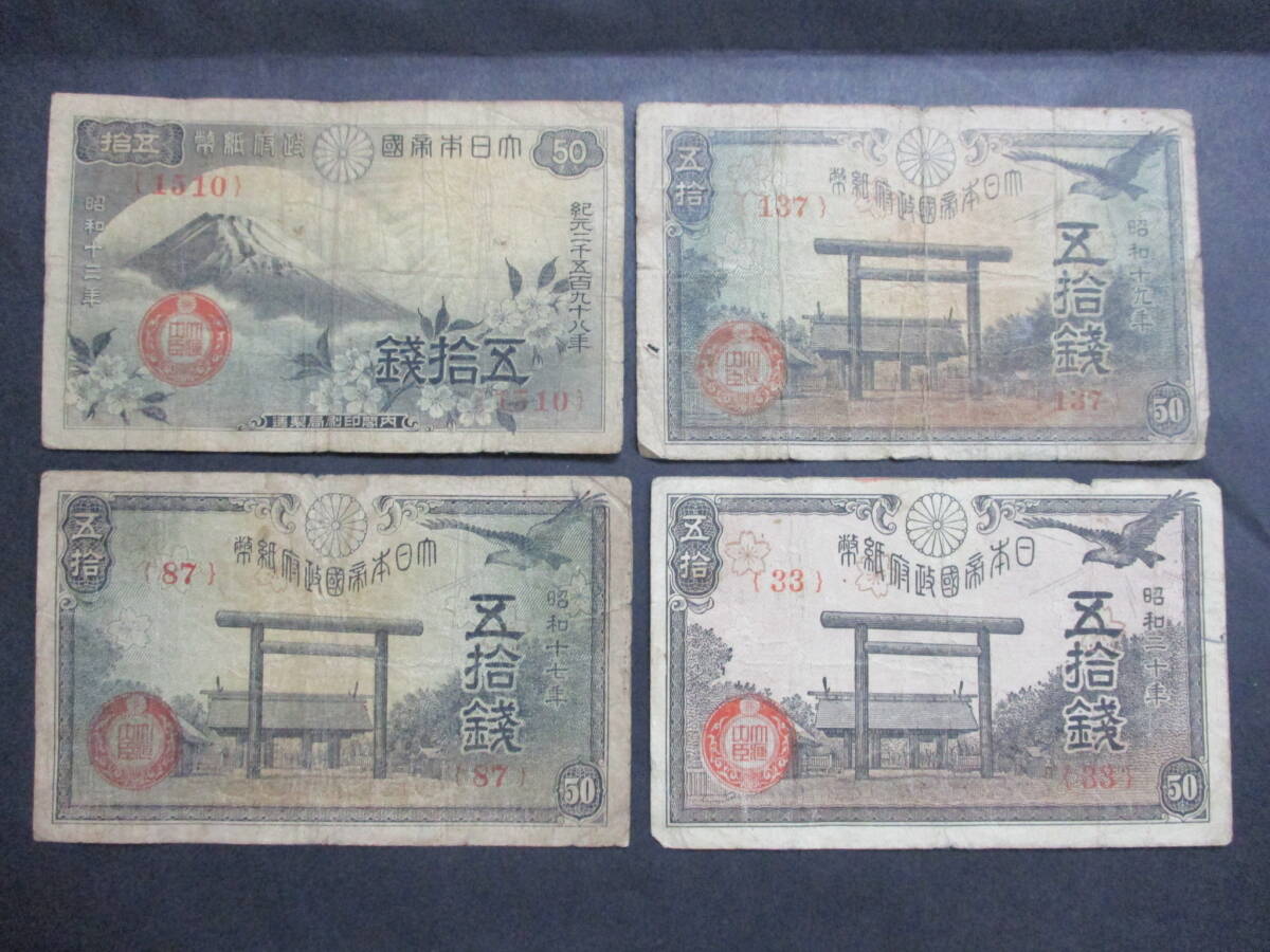 - ★富士桜50銭札1枚・靖国50銭札昭和17年・19年・20年各1枚 普通流通品 計4枚★