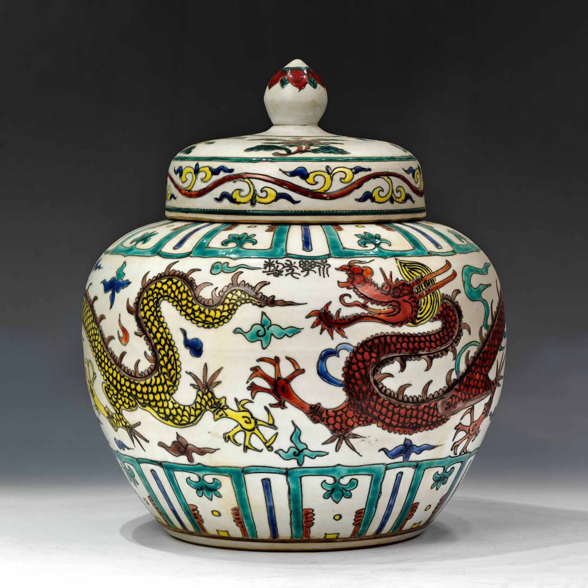 - 8+GV7096「東洋美術」 中国骨董 人間国宝 磁器製品【通景五彩流雲龍文蓋壺】 旧物 孤品 珍品 陶磁器 収蔵価値が高い
