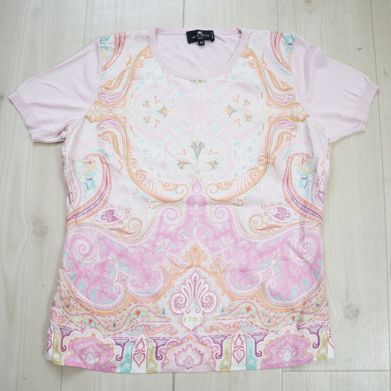 - ETRO エトロ ペイズリー柄 レーヨン/シルク ニット 半袖 カットソー 44 ピンク K08-k065