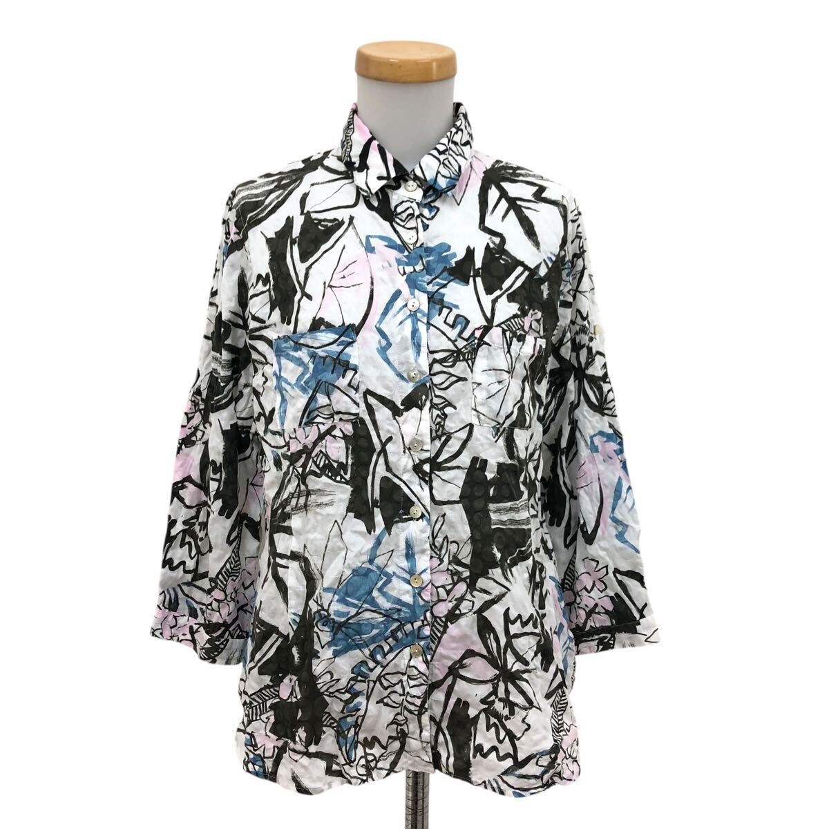 > 8Nm317-49 TROIS BONHEURS トロワボヌール 総柄 七分袖 コットン シャツ ブラウス トップス ホワイト系 レディース 40 日本製