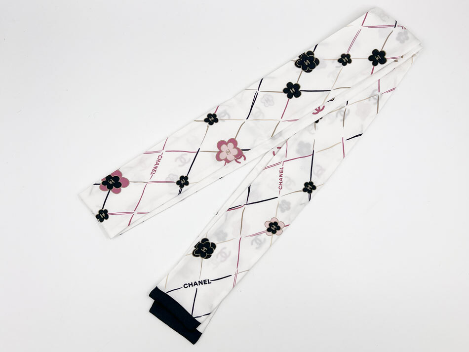 - CHANEL シャネル ヘアバンド ツイリー スカーフ カメリア シルク ブラック ホワイト 160cm 美品