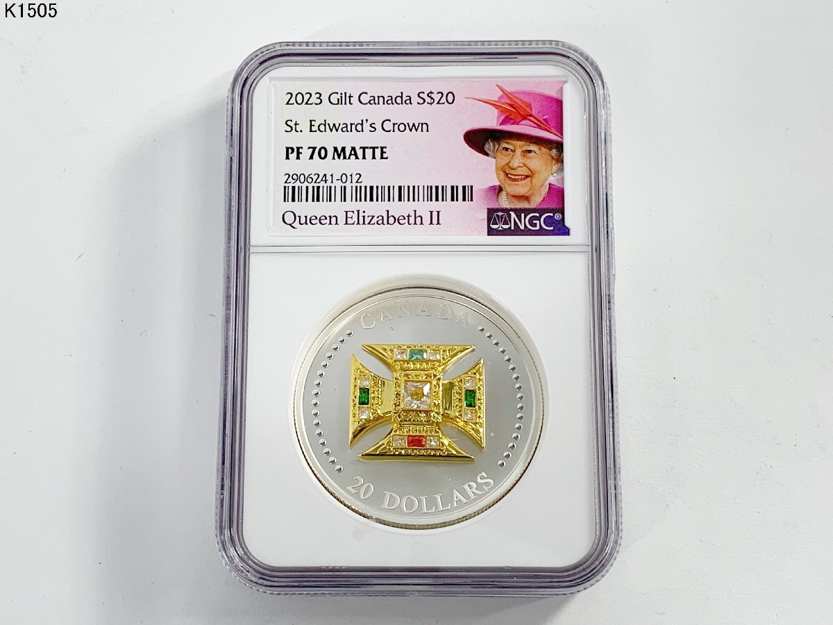 > 2023年 カナダ 聖エドワード 王冠 20ドル銀貨 エリザベス二世 NGC 鑑定 PF70 マットプルーフ ケース入り K1505F