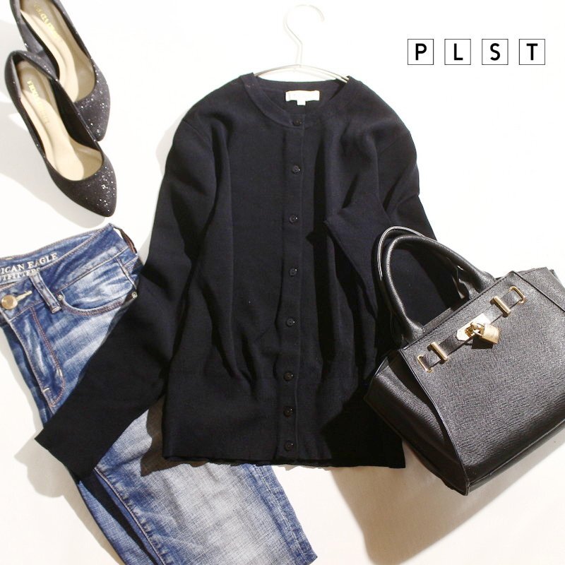 > 美品 プラステ PLST 春 夏 さらり ストレッチ 丸首 ニットカーディガン S ブラック 黒 サマーニット シンプル オフィス 通勤 無地 羽織