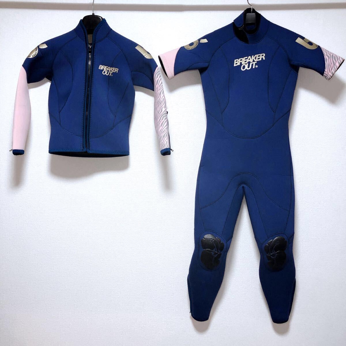 > 美品 BREAKER OUT ウェットスーツ 着丈 約124cm 半袖 2ピース ゼブラ柄 ピンク ネイビー サーフィン ダイビング 裏起毛 シーガル 823C-25