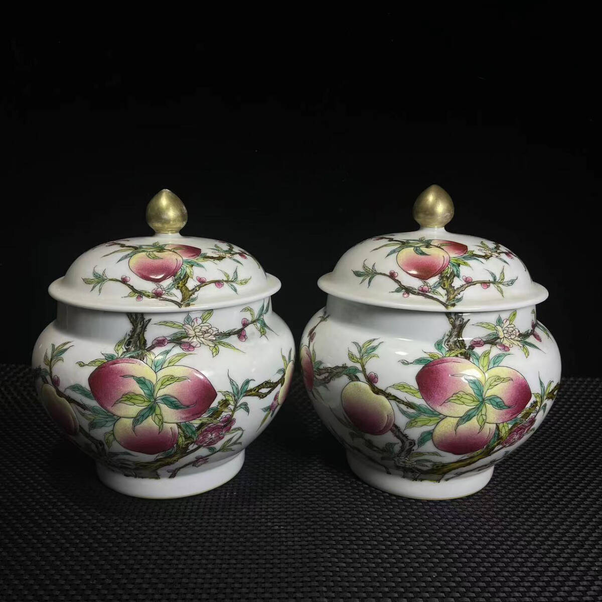 - 8+GV7364「東洋美術」 中国骨董 人間国宝 磁器製品【清朝乾隆時代金箔長寿桃壺蓋付】 旧物 孤品 珍品 陶磁器 収蔵価値が高い