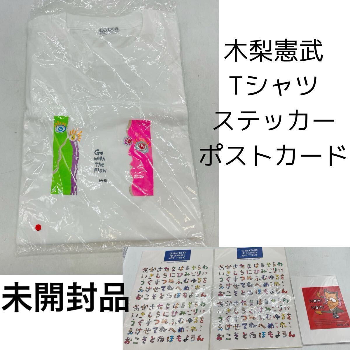 > 【未開封】木梨憲武 2003年 Go with The Flow展 Tシャツ 半袖 フリーサイズ アルファベット&50音ステッカー2枚 ポストカード