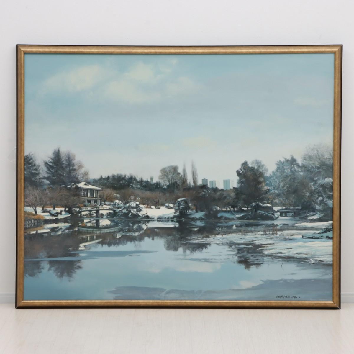 - 黒沢信男 迫力 100号油彩大作!「池畔春雪 (新宿御苑)」キャンバス 真作保証 額装 雪景