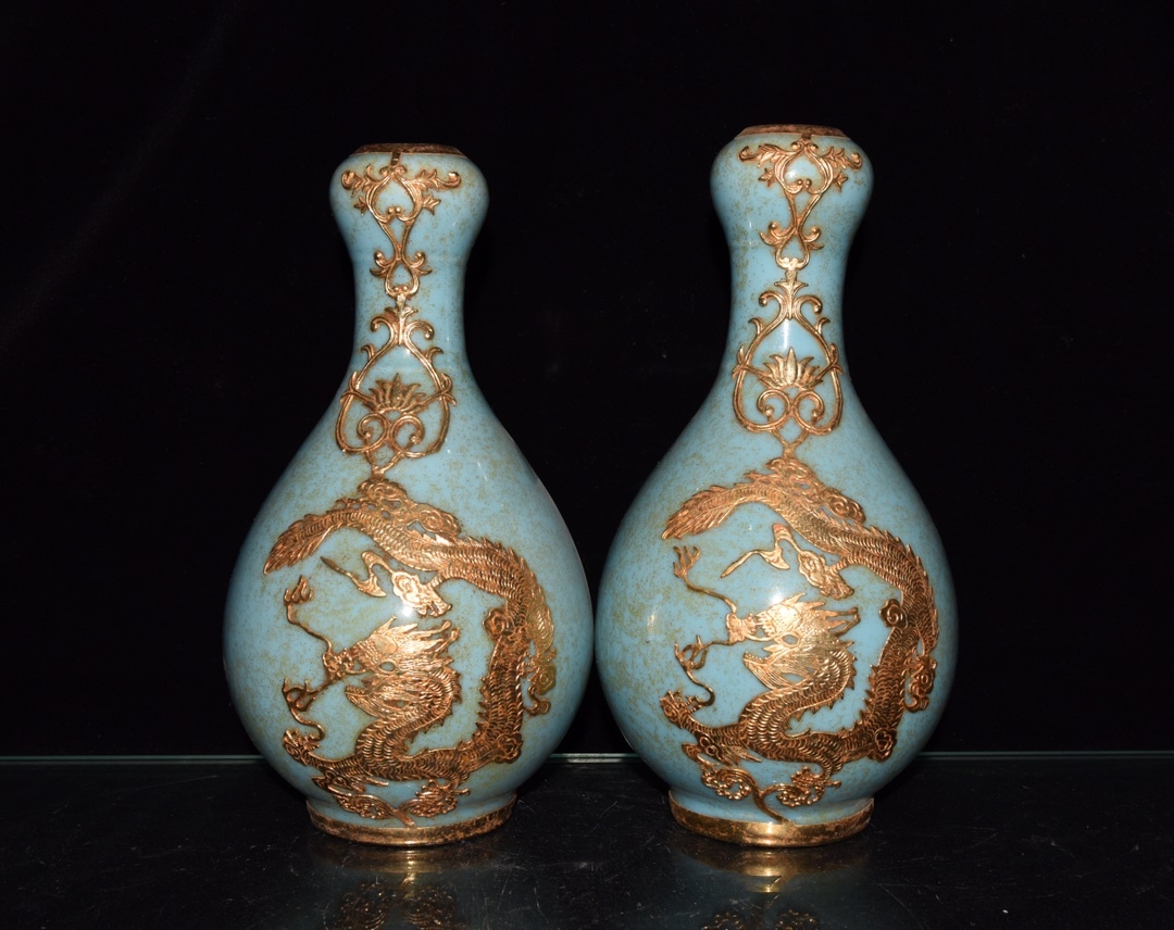 - LB110■大清乾隆年制製 天青釉 包み金龍紋蒜頭瓶一対 珍品 時代物 古玩 唐物 古陶磁器■