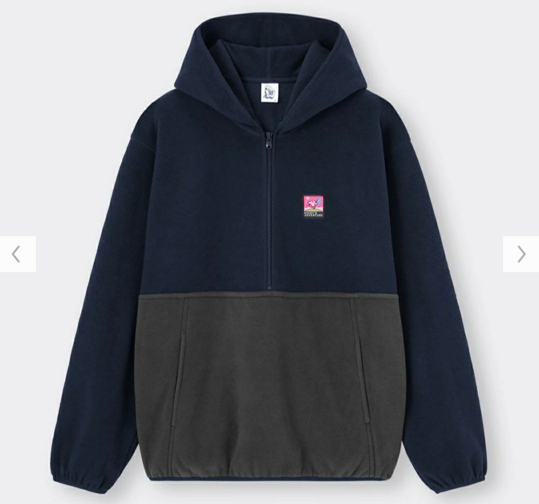 > メンズSサイズ 新品 マイクロフリース ハーフジップパーカー 星のカービィ 刺繍 Kirby ネイビー 紺 フリースパーカー フーディ GU 男女兼用