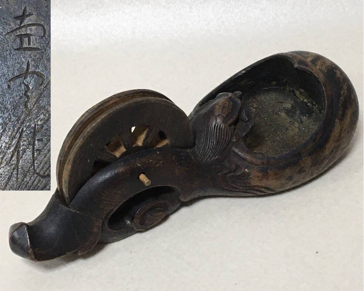 - E422 墨壷 木彫り 亀彫 在銘 大工道具 宮大工 墨つぼ 木製 彫刻