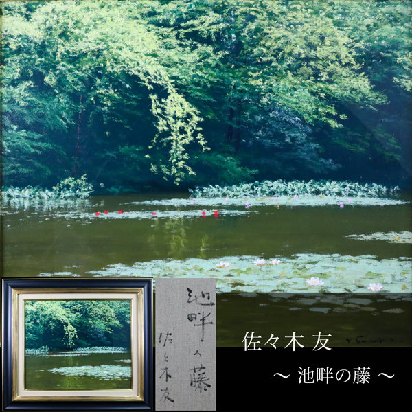 > ◇雅◇ 真作保証 佐々木友 「池畔の藤」 油彩 キャンバス 8号 大作 風景画 直筆サイン 裏書 睡蓮の池名画 額装 /RYO.25.8 [M69.1] QP2